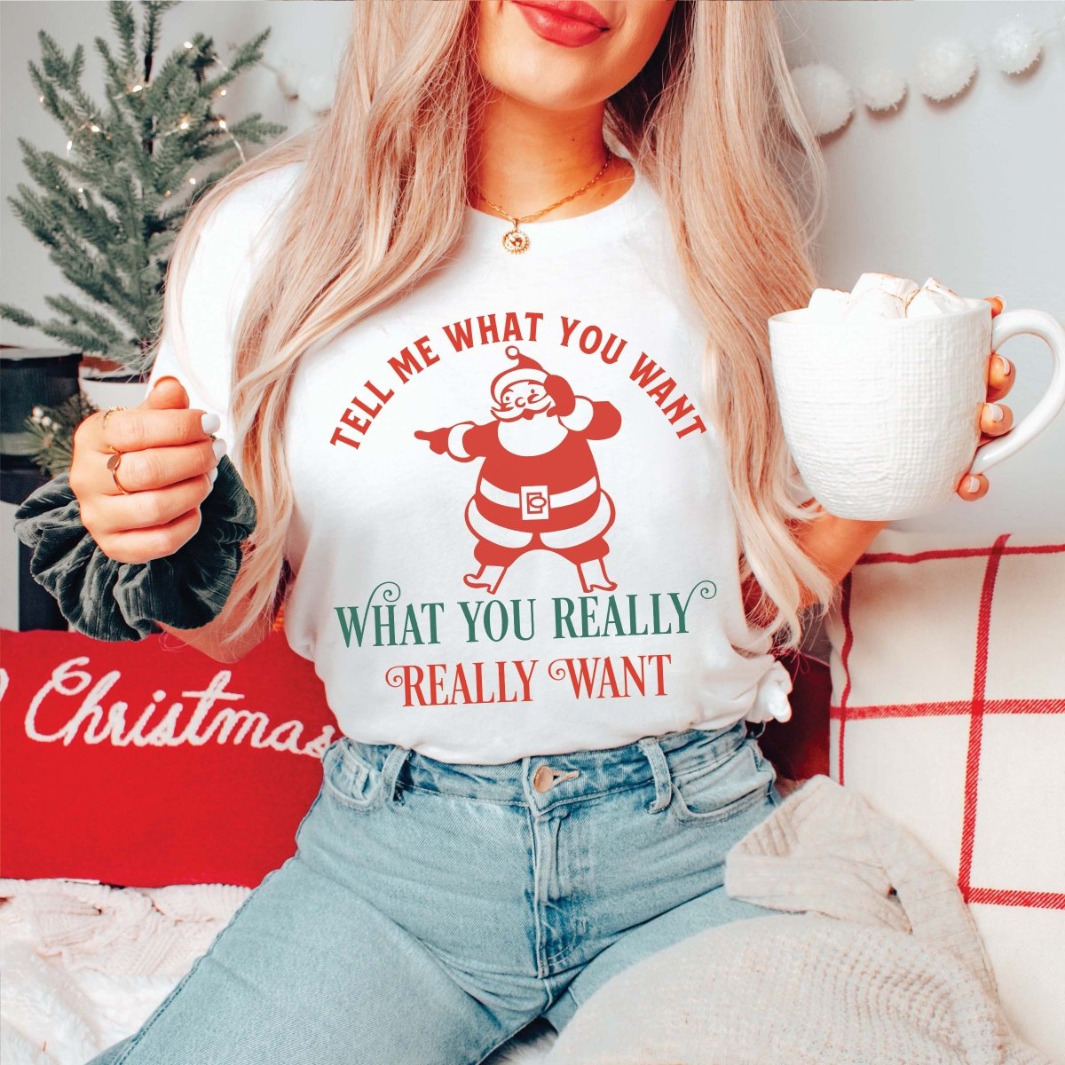 Santa’s listening… so tell me what you want! The Tell Me What You Want Santa Bella Graphic Tee brings a touch of humor and holiday cheer to your wardrobe. Featuring a fun graphic and ultra-soft Bella fabric, it’s perfect for spreading festive vibes while staying comfy. Whether you’re making your Christmas wish list or just getting in the holiday spirit, this tee is your go-to for a little seasonal sass. Make a statement and let Santa know exactly what’s on your mind this