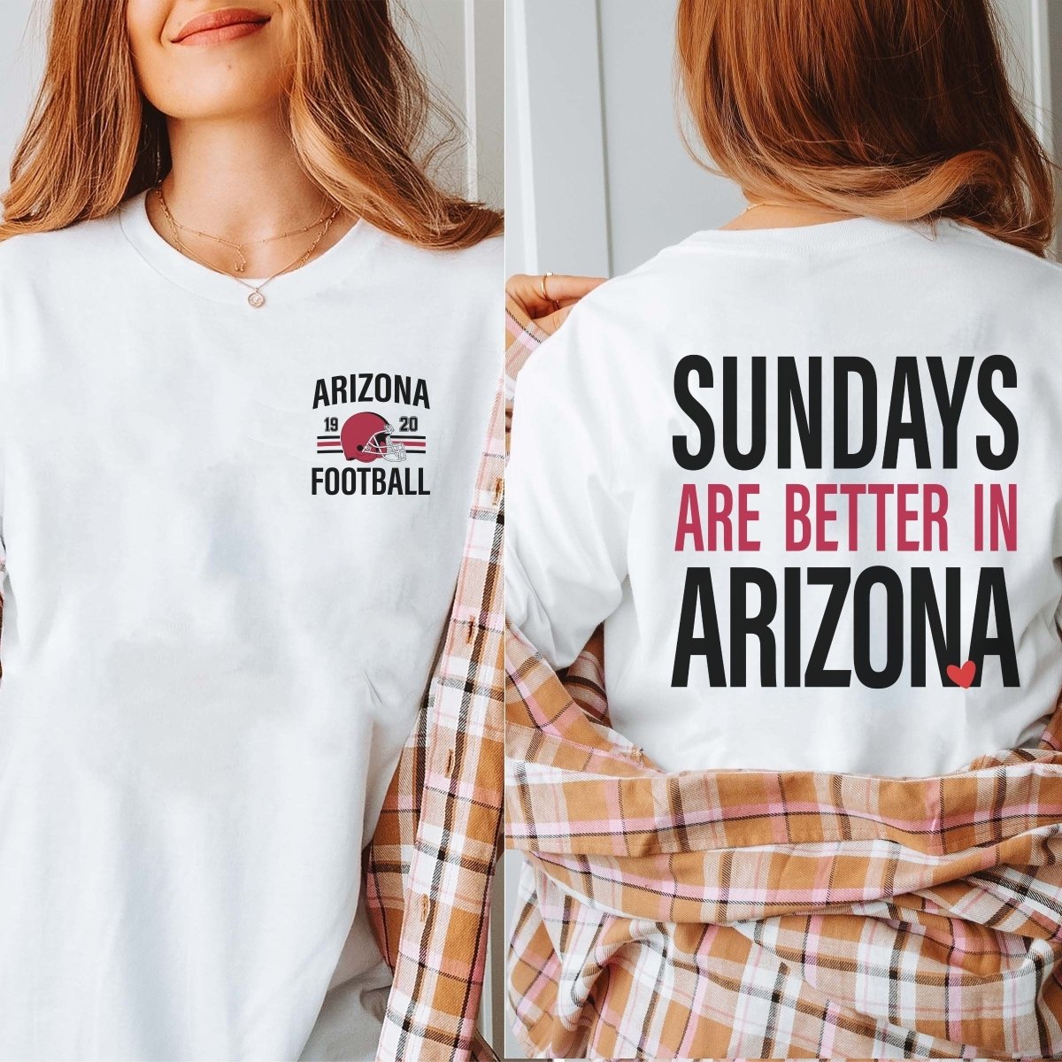 Sundays, but make them game day. The “Sundays Are Better In Arizona Bella Graphic Tee With Front And Back Design” graphic tee brings bold Arizona pride in a soft, lived‑in feel—perfect for tailgates, errands, and everything in between.