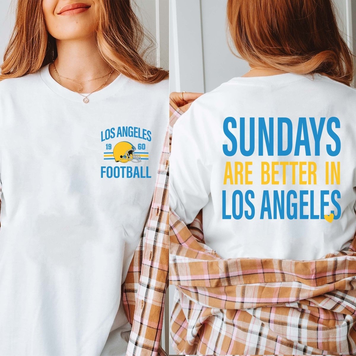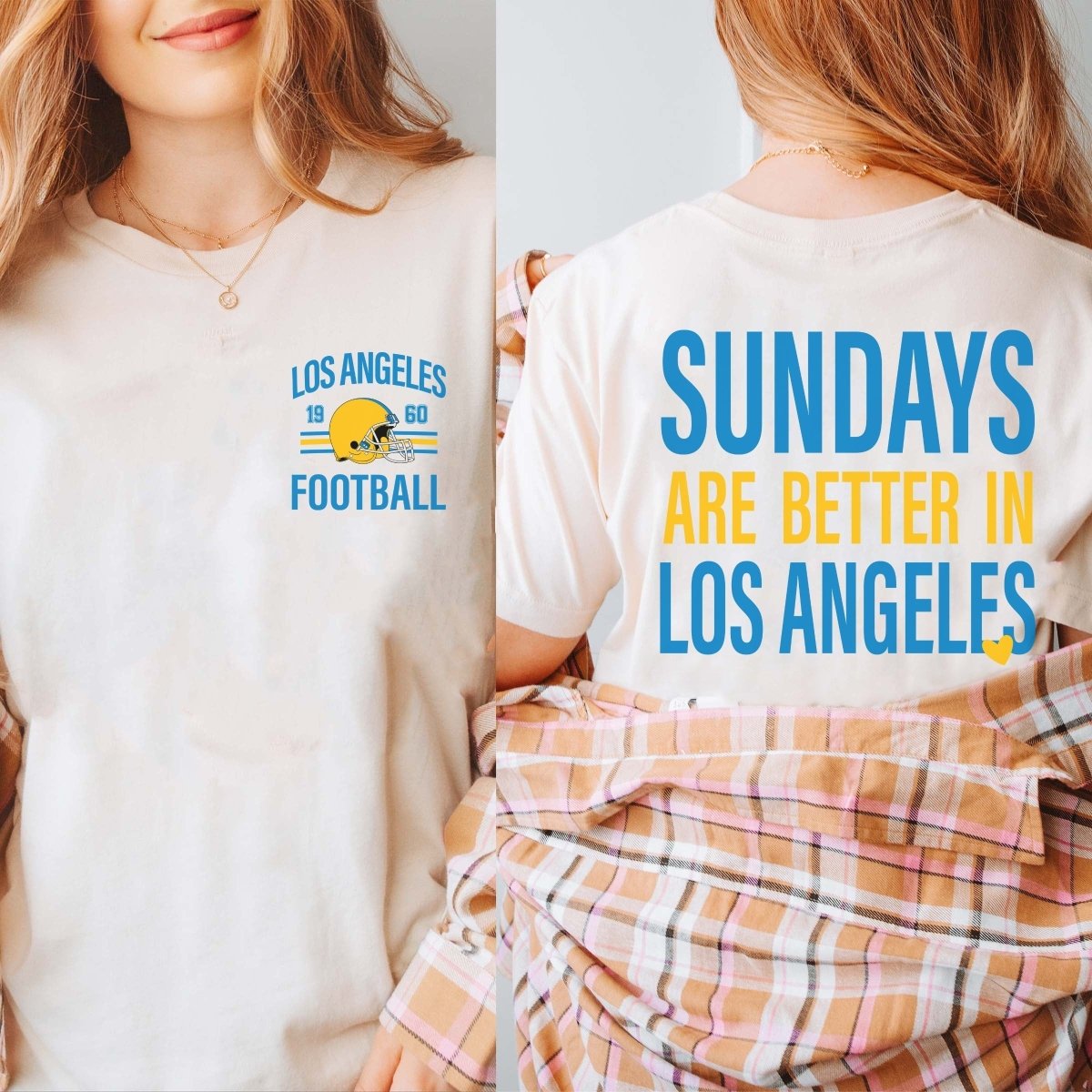 Sundays, but make them game day. The “Sundays Are Better In Los Angeles Bella Graphic Tee With Front And Back Design” graphic tee brings bold Los Angeles pride in a soft, lived‑in feel—perfect for tailgates, errands, and everything in between.