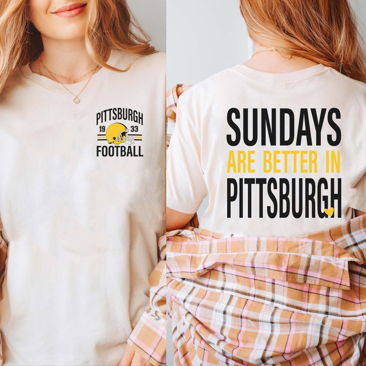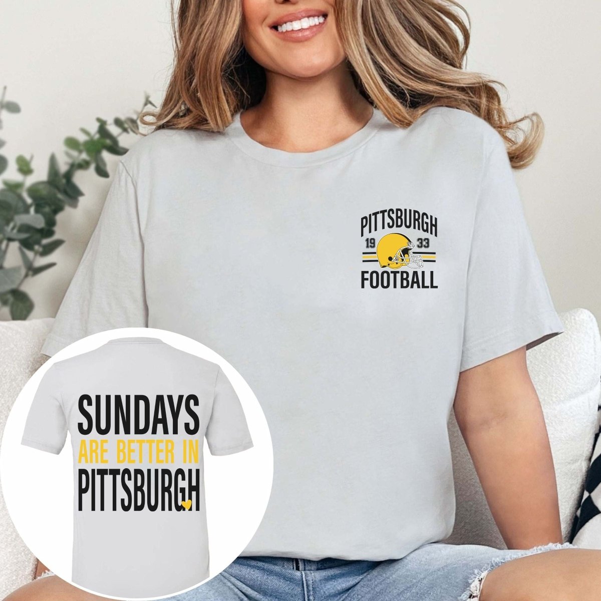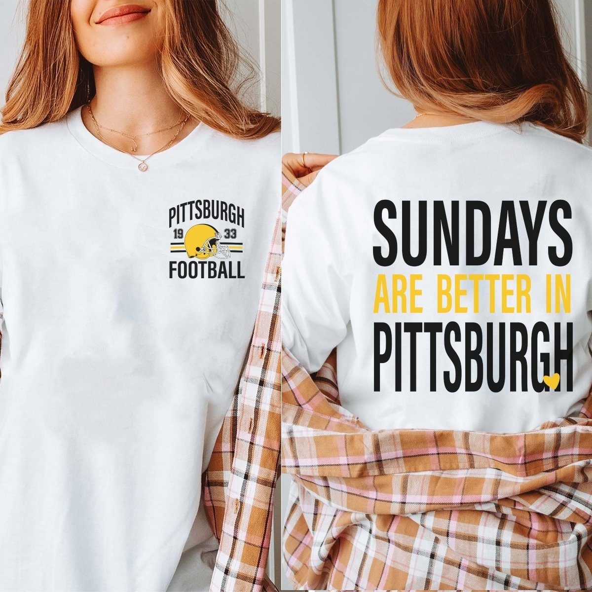 Sundays, but make them game day. The “Sundays Are Better In Pittsburgh Bella Graphic Tee With Front And Back Design” graphic tee brings bold Pittsburgh pride in a soft, lived‑in feel—perfect for tailgates, errands, and everything in between.