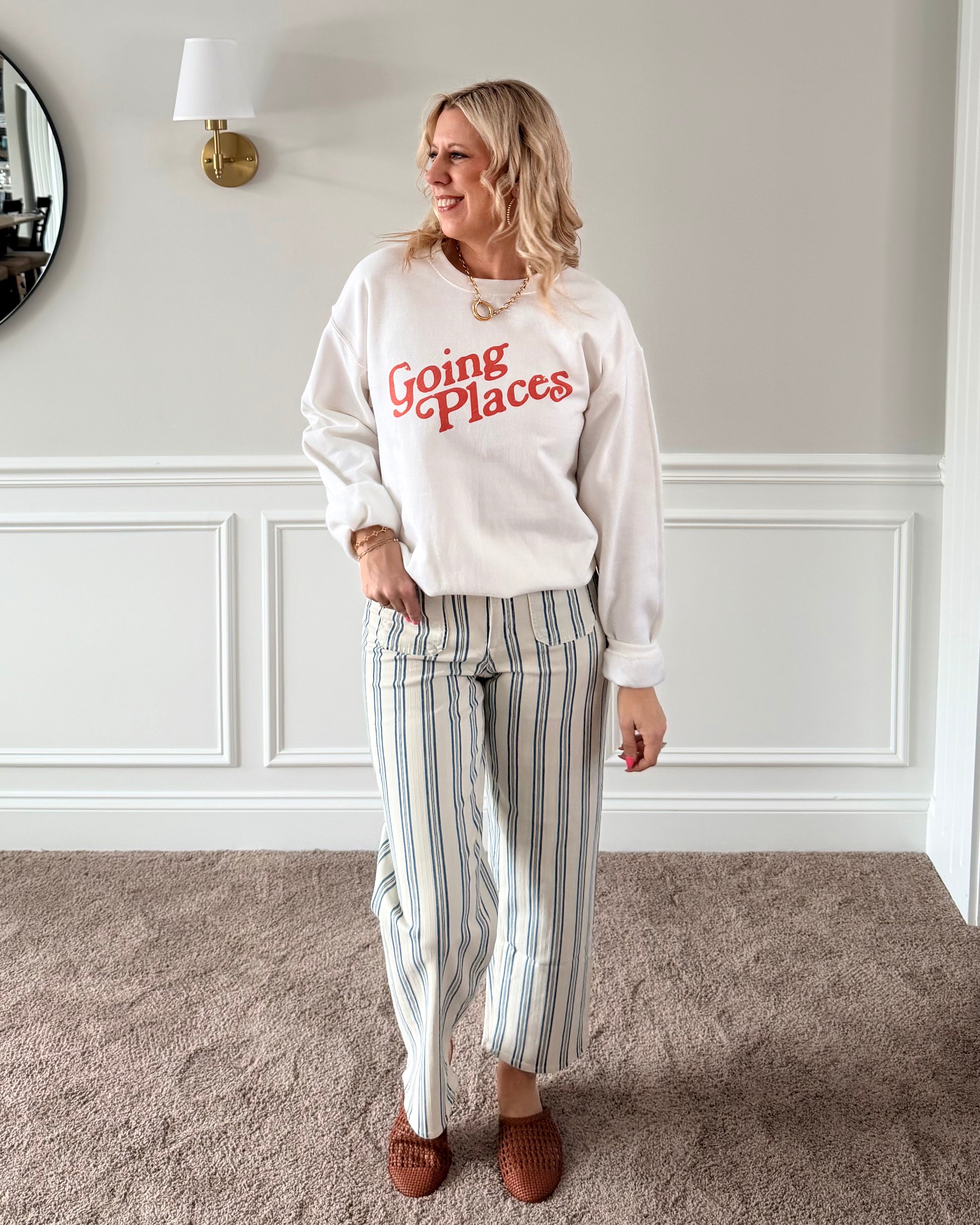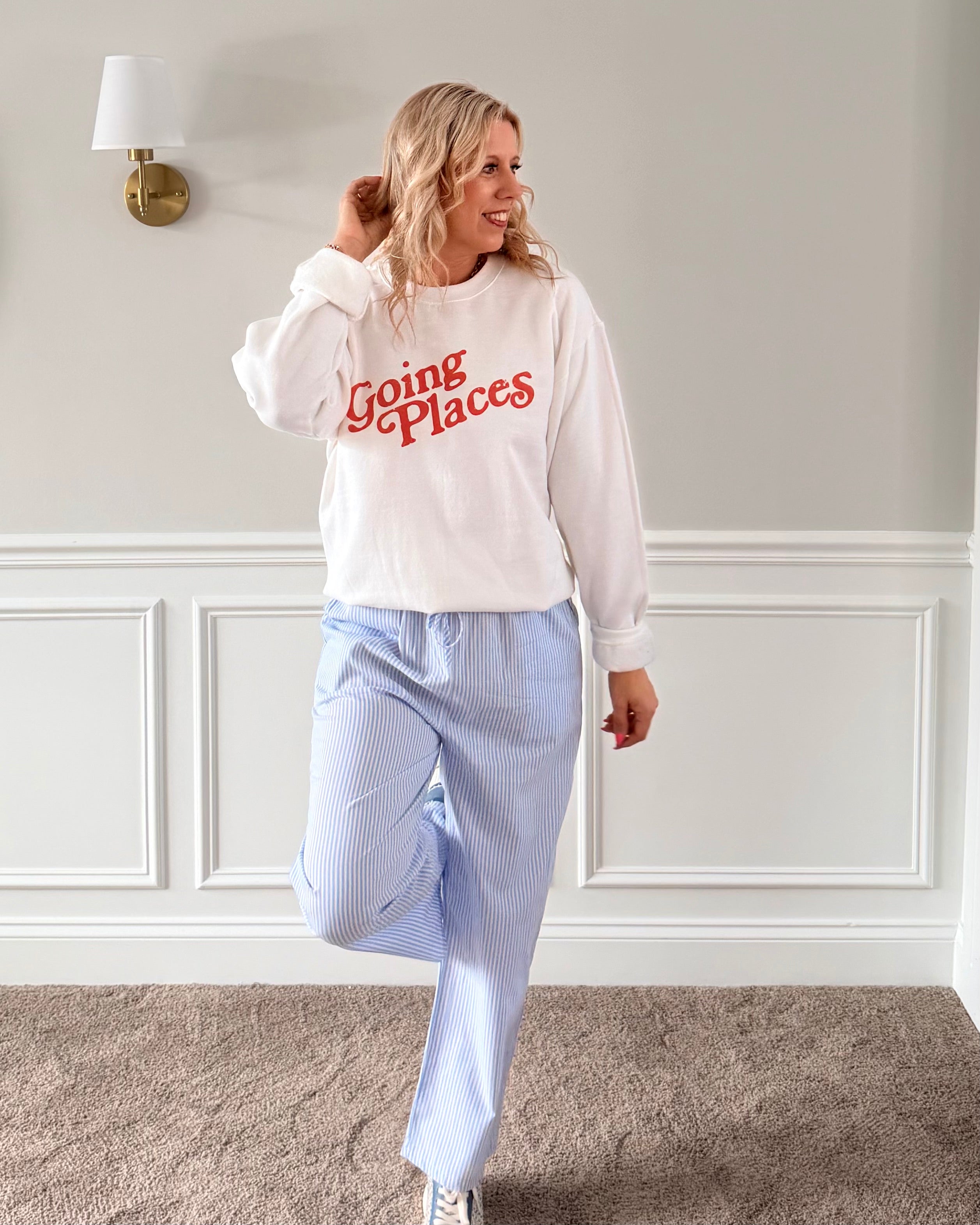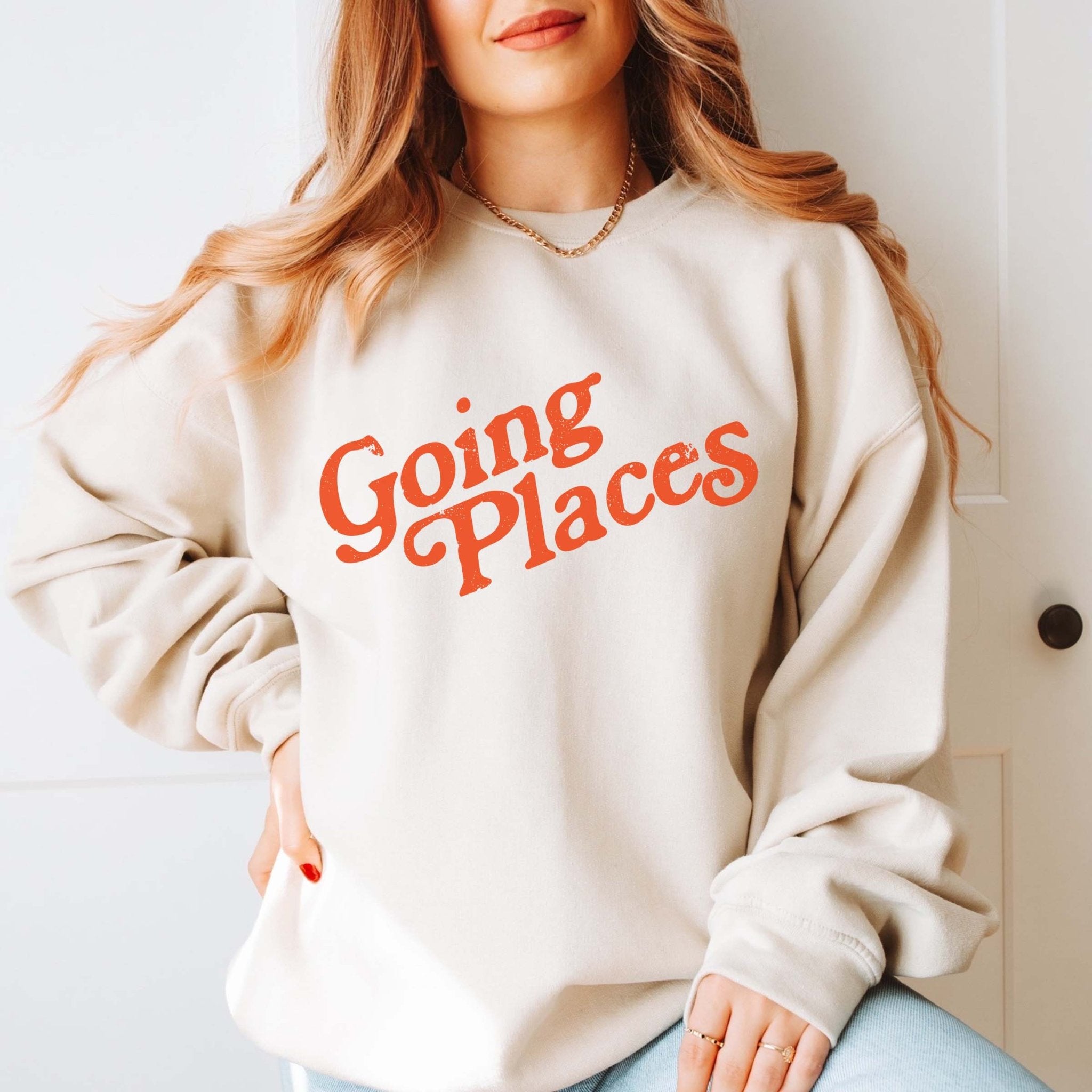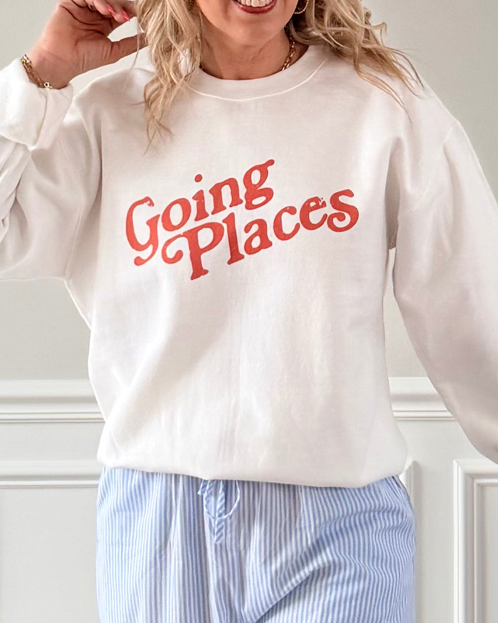 That cozy-but-motivated kind of vibe. This “Going Places” graphic sweatshirt is for the dreamers, the doers, and the ones who know their best chapters are still ahead. Easy, encouraging, and effortlessly cute—this one’s made to throw on and go (because, obviously, you’ve got places to be).