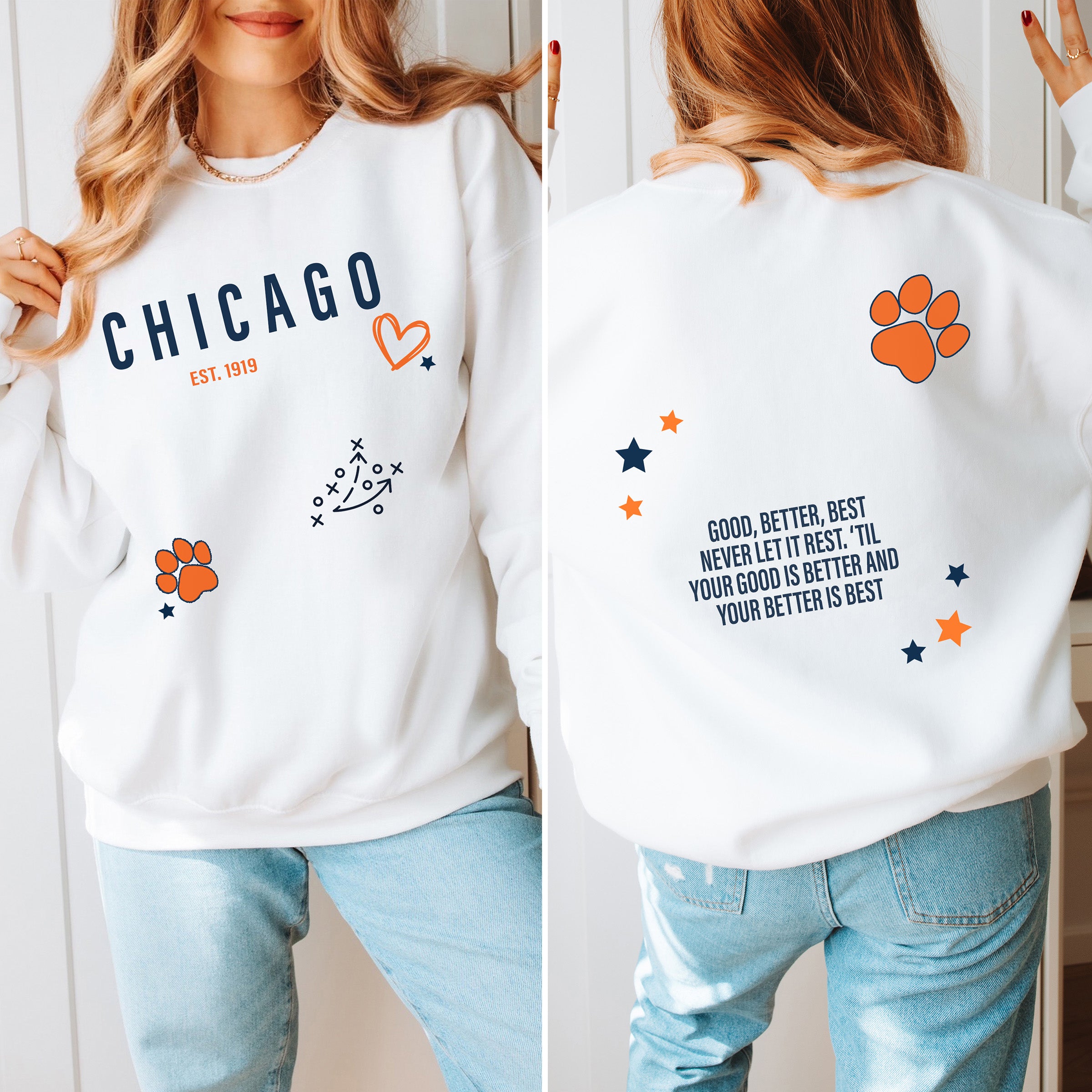 This Chicago graphic sweatshirt features a collage-style front design with playful icons, stars, and paw details, paired with an empowering “Good, Better, Best” message printed on the back. Designed to feel elevated but still easy to wear, it’s perfect for game days, casual weekends, and everyday layering. Printed direct to garment for a soft, no-feel finish that lasts wash after wash.