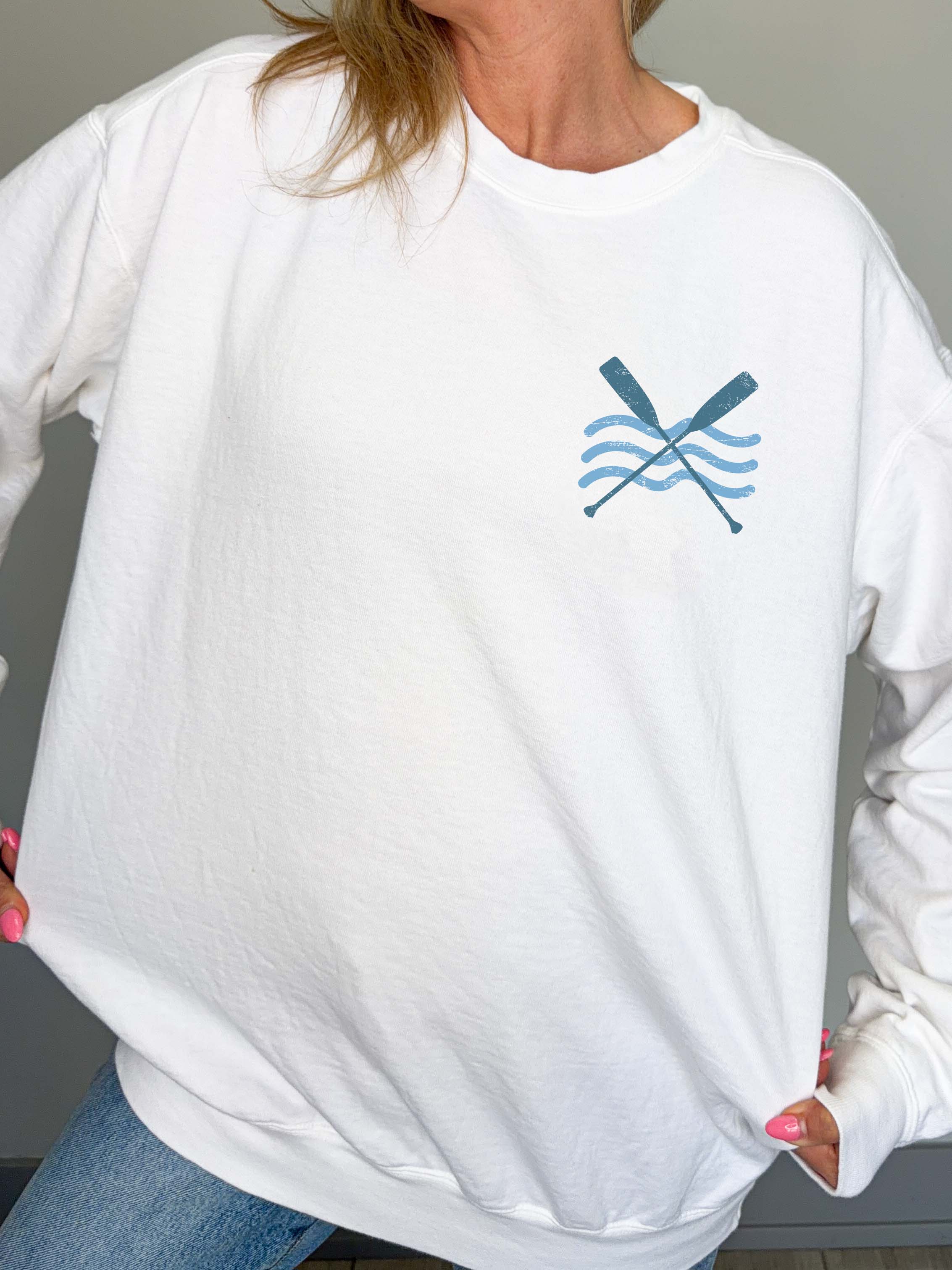 Calling all lake lovers, cabin enthusiasts, and waterfront dreamers! This premium comfort color sweatshirt features a charming crossed oars graphic on the front chest and bold "Drift Easy" lettering with wave details and "LAKE LIFE" on the back. Whether you're cozying up by the fire at the lake house, enjoying crisp mornings on the dock, or running errands in laid-back style, this lake-inspired sweatshirt keeps you looking stylish and feeling incredibly comfortable.