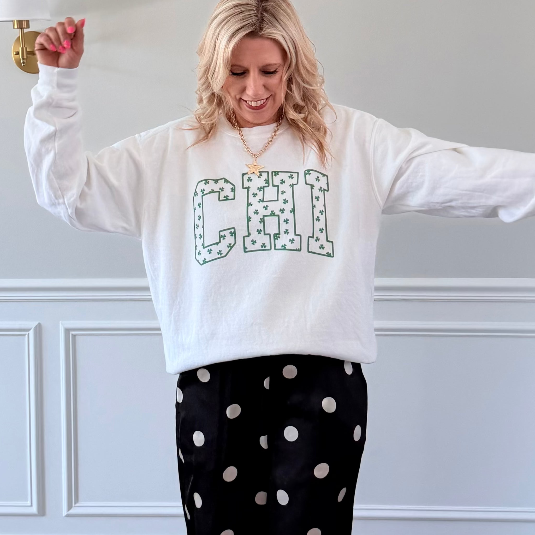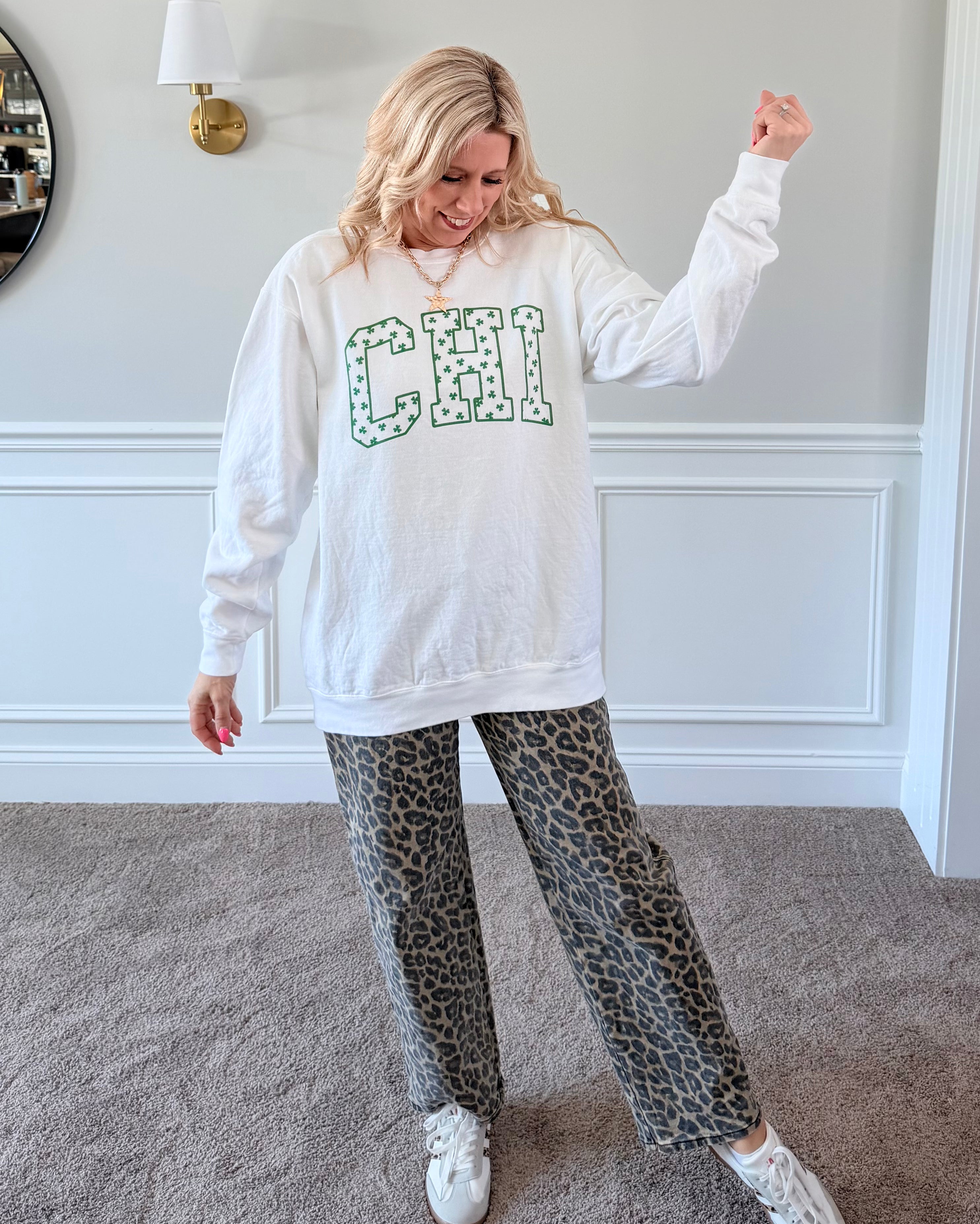 Bold CHI lettering filled with a playful shamrock pattern for subtle St. Paddy’s vibes