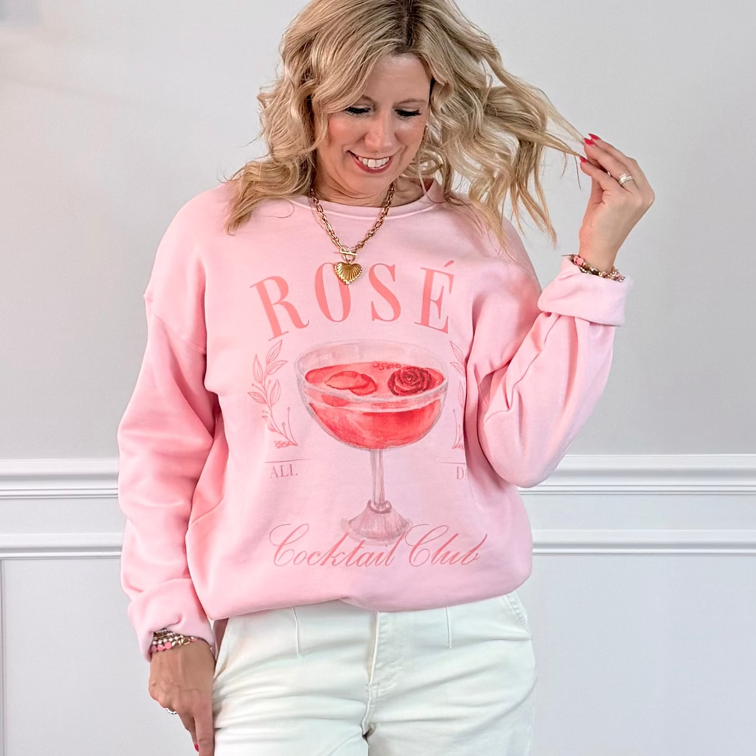 Meet your new favorite cozy companion: the Rosé All Day Cocktail Club Crew Sweatshirt! Crafted from high-quality materials, this sweatshirt beautifully marries style with comfort, making it a great choice for those who love life's little luxuries.