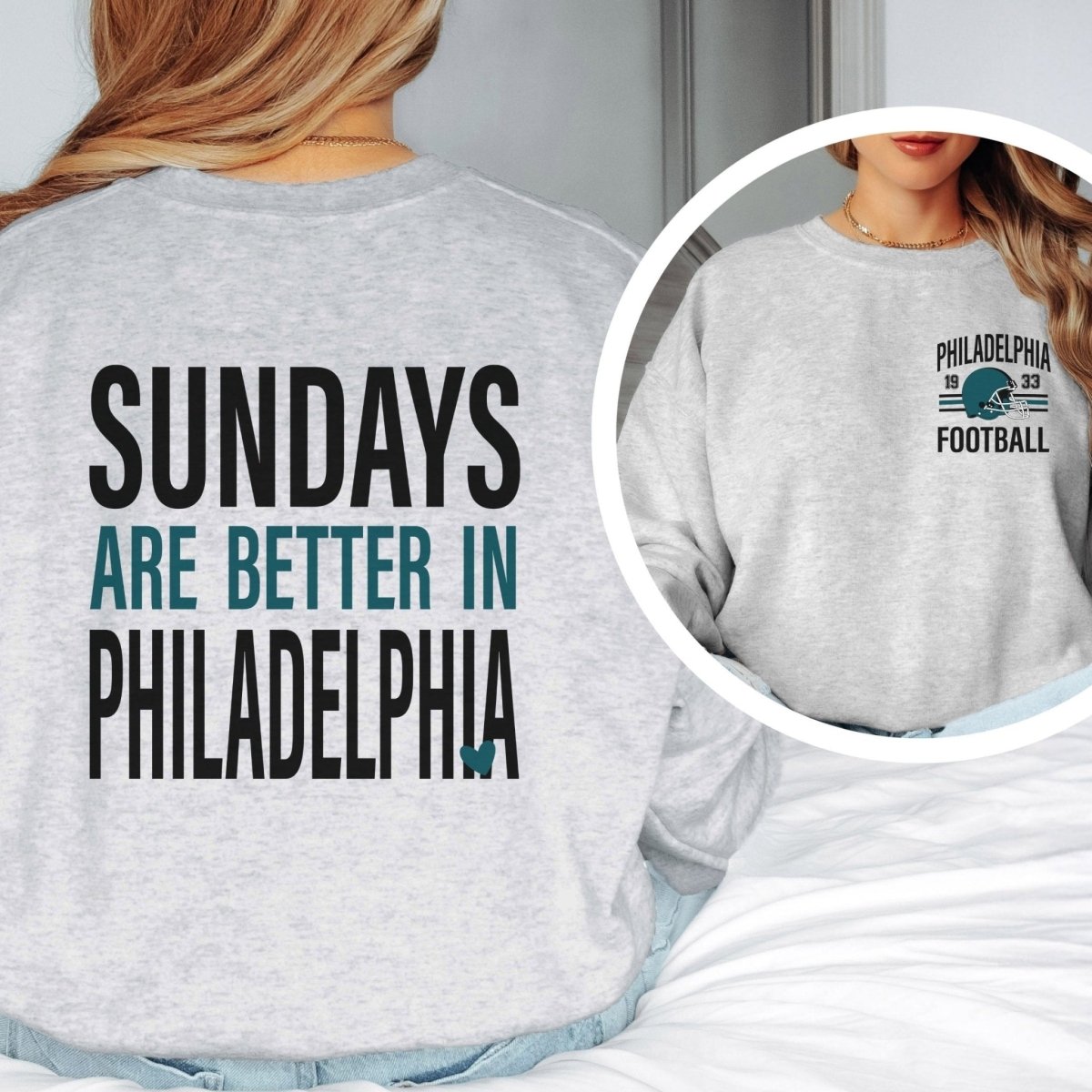 Sundays, but make them cozy. This “Sundays Are Better in Philadelphia” sweatshirt keeps your Philadelphia pride front and center with a relaxed fit that’s perfect for stadium nights, tailgates, or couch coaching.