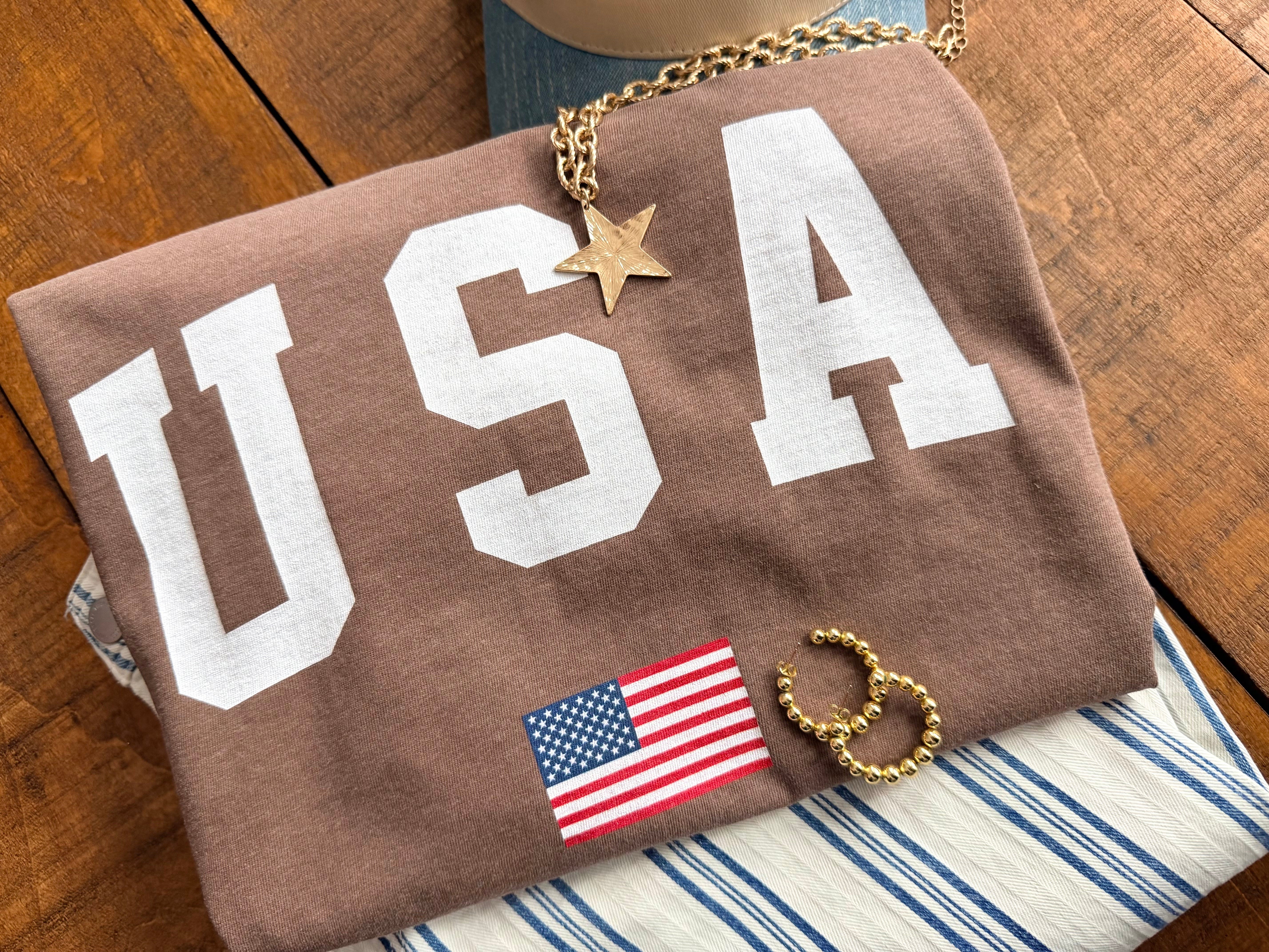 Simple, classic, and effortlessly patriotic—this USA Flag graphic tee is one of those throw-on-and-go staples you’ll reach for again and again. With bold varsity-style lettering and a subtle American flag detail, it gives just the right amount of patriotic flair without feeling loud or overdone. It’s the kind of tee that works for everything from coffee runs to summer celebrations and casual everyday wear.