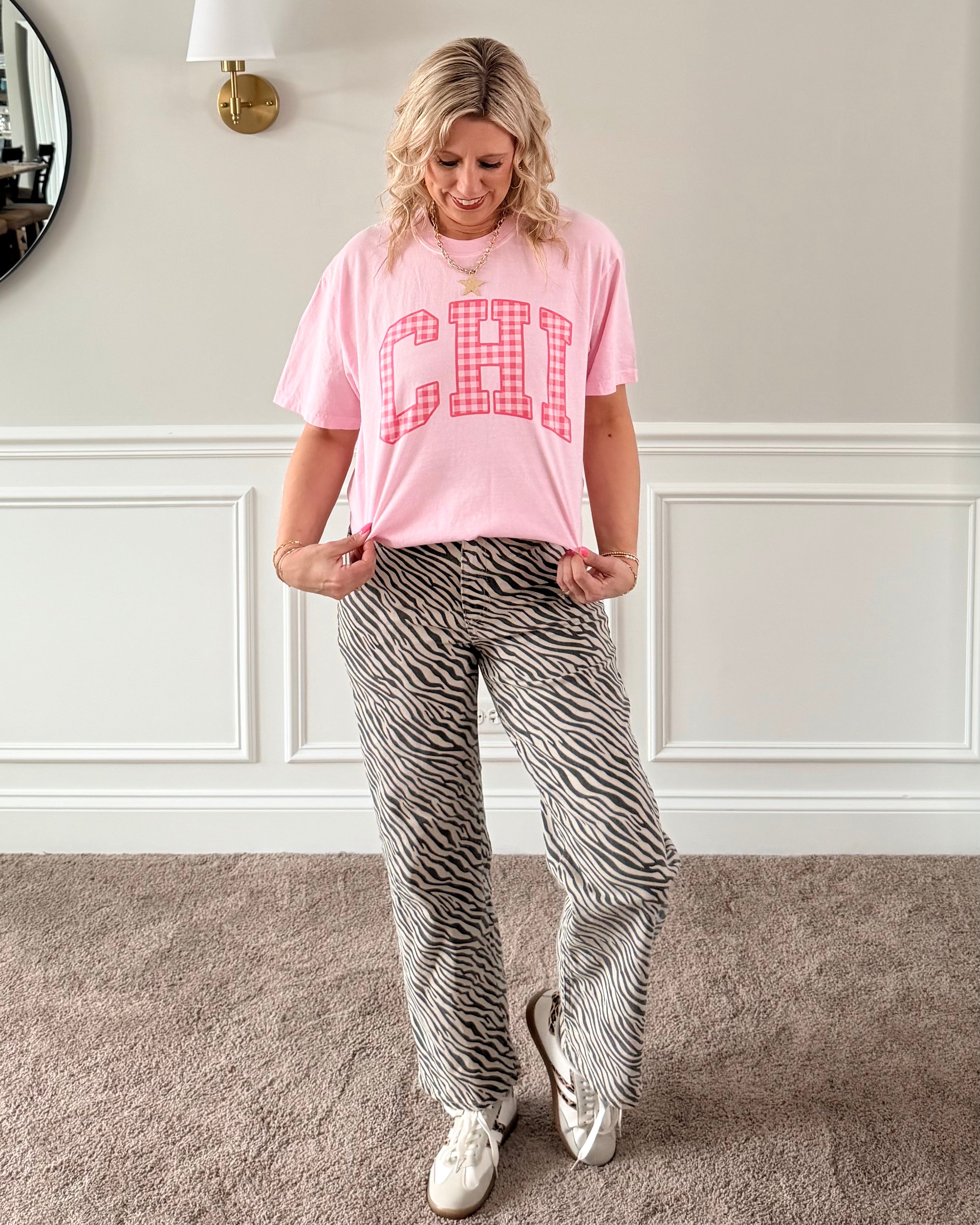 – Bold varsity-style CHI lettering filled with pink gingham