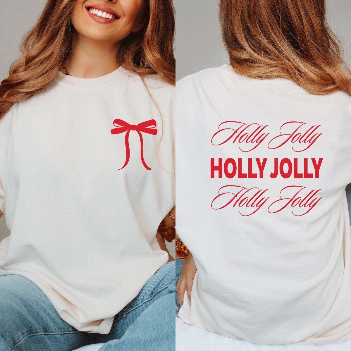 Double-sided design with a red bow on the front and “Holly Jolly” graphic on the back
